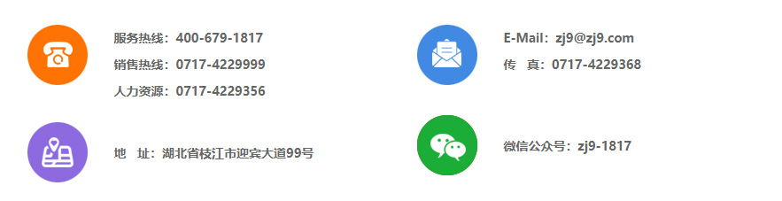 服務(wù)熱線:4006791817 人力資源部:0717-4229356 郵政編碼:443200 E-mail:zj9@zj9.com 地址:湖北省枝江市迎賓大道99號 鄂ICP備05003662號-1