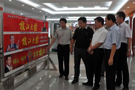 枝江酒業(yè)黨委書記張華(左一)向趙市長(左三)介紹枝江酒業(yè)不同發(fā)展階段的形象代言人8月27日,黑龍江省綏化市委常委、常務(wù)副市長趙萬山一行…