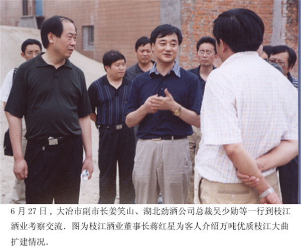 6月27日,大冶市副市長姜笑山、湖北勁酒公司總裁吳少勛等一行到枝江酒業(yè)考察交流。圖為枝江酒業(yè)董事長蔣紅星為客人介紹萬噸優(yōu)質(zhì)枝江大曲擴(kuò)建工…