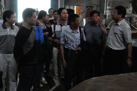 在枝江酒業(yè)黨委書記張華的熱情陪同下,來自問安小學(xué)的教師們參觀了歷史文化展廳、產(chǎn)品展示廳、5萬噸灌裝中心及釀造五車間,深刻了解了枝江酒業(yè)悠久的歷史文化背景,親身感受了酒香四溢、蒸汽環(huán)繞的釀酒場面,品嘗了新釀的熱氣騰騰的枝江原酒。特別在歷史文化展廳,老師們看到栩栩如生的關(guān)廟山模型,感到特別熟悉和親切,因?yàn)殛P(guān)廟山遺址與問安小學(xué)近在咫尺。“不身臨其境,感受不到枝江酒釀造的神奇?!痹趨⒂^了釀造五車間之后,一名老師深有感觸地說道。在枝江酒業(yè)多功能廳,老師們還觀看了枝江酒業(yè)社會(huì)扶貧宣傳片“心與力的行走”,認(rèn)真、全面地了解了枝江酒業(yè)人的社會(huì)責(zé)任擔(dān)當(dāng)和人文關(guān)懷。臨別,盛德剛校長還代表問安小學(xué)向枝江酒業(yè)贈(zèng)送了“百年枝江,薪火相傳”的書畫作品,他表示,從枝江酒業(yè)的釀酒文化中,受到了觸及心靈的啟發(fā),他們會(huì)把這種奮發(fā)向上的精神帶回學(xué)校,植根在孩子們的心靈中。