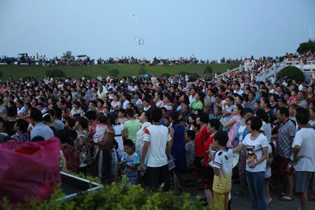 廣場(chǎng)上、江堤上、圍欄上的觀眾