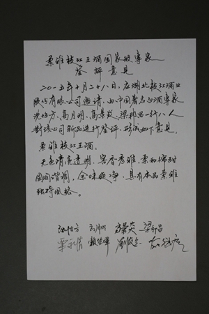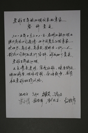 專家們在集體品評了柔雅“枝江王”和柔雅“百年枝江”后,給予了這兩大單品很高的評價。中國釀酒大師、中國白酒專家委員會專家賴登燡先生當(dāng)場揮毫寫下“韻雅香遠”,還送給枝江酒業(yè)幾幅楹聯(lián):一枝清流融江水,千載風(fēng)雅醉華夏;枝頭明月清輝籠乾坤,江上春風(fēng)香醇流千載。行云流水的行草,蒼勁中有清秀,灑脫中有內(nèi)斂。無論是內(nèi)容還是筆墨,都與枝江酒的風(fēng)格相一致,表達了與會專家對枝江酒業(yè)的深情厚誼。