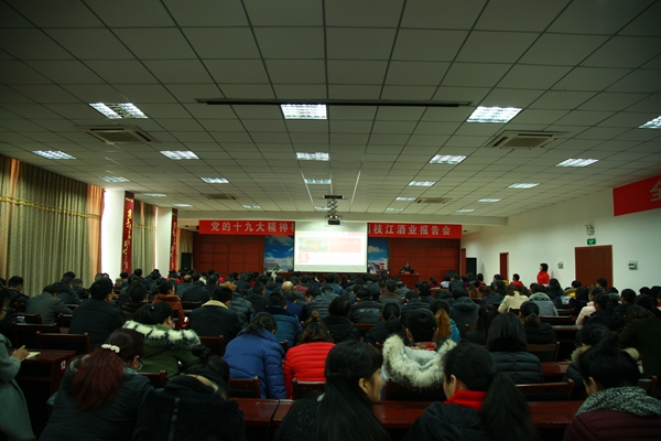 為進(jìn)一步將學(xué)習(xí)宣傳貫徹黨的十九大精神引向深入,更好地用習(xí)近平新時(shí)代中國特色社會主義思想武裝頭腦,指導(dǎo)和推動枝江酒業(yè)改革發(fā)展和黨建工作,12月7日,枝江酒業(yè)舉辦學(xué)習(xí)貫徹黨的十九大精神報(bào)告會。特邀黨的十九大精神市委宣講團(tuán)成員、市直機(jī)關(guān)工委常務(wù)副書記楊義華為公司干部職工作了一場精彩生動的宣講報(bào)告。報(bào)告由公司黨委委員、董事會秘書劉先鵬主持。公司領(lǐng)導(dǎo)蔣紅星、張華、劉前生、亓新明、楊家法參加報(bào)告會,公司各部門、車間負(fù)責(zé)人及黨員干部和職工代表共300多人聆聽了報(bào)告會。